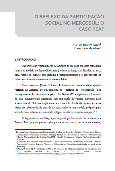 [...] Foi observado a estrutura de retroalimentação desenvolvida pela REAF que permite a maior participação social nas decisões do MERCOSUL.Essa participação tem possibilitado cada vez mais o desenvolvimento de políticas públicas mais adequadas e adaptadas à realidade da agricultura familiar e como consequência tem-se a geração de resultados positivos para os envolvidos. [...]